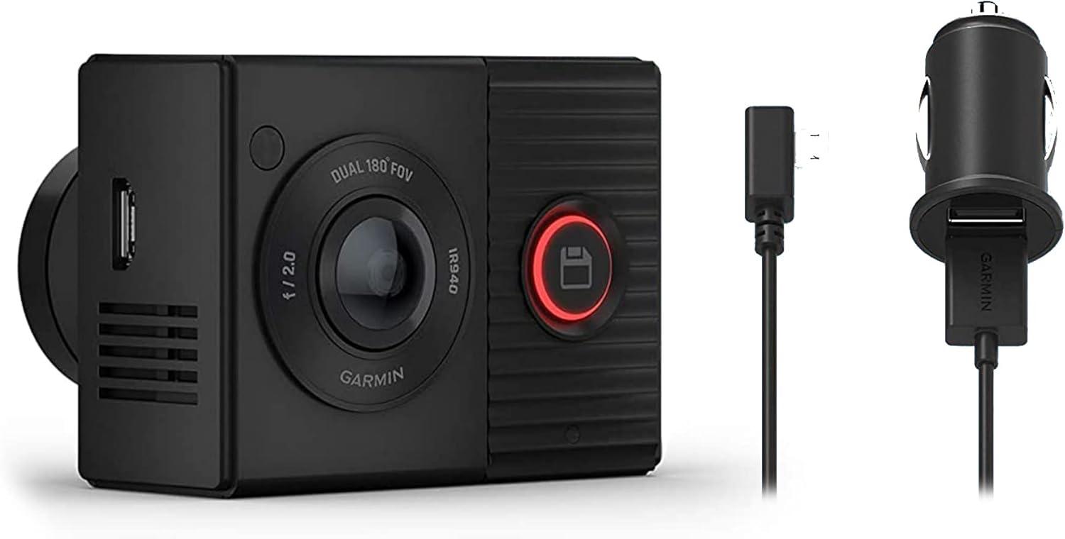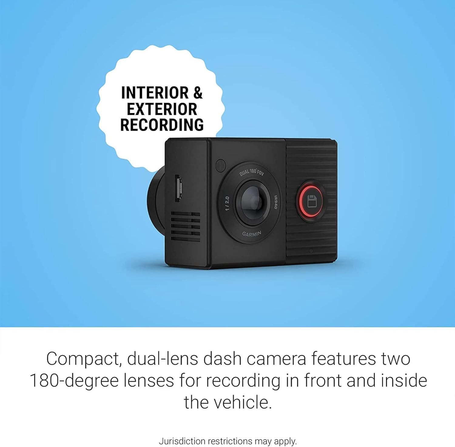 Make sure you’re covered from every angle with Garmin Dash Cam Tandem. This compact dual-lens dash camera features two 180-degree lenses recording in tandem to provide drivers with complete video coverage day and night. The front-facing lens records in super HD 1440p to capture crisp footage showing critical vehicle details, while the interior lens has night vision featuring exclusive NightGlo technology to see all driver and passenger activity in any light. The charger includes an extra USB port, letting drivers charge their phone on the go. Use voice commands (available in English, German, French, Spanish, Italian and Swedish) to control the camera — hands-free — while built-in GPS shows when and where events occurred and incident detection automatically saves video before and after an incident. Easily view and share video from your smartphone by using the Garmin Drive app (requires a compatible smartphone enabled with GPS and BLUETOOTH Low Energy technology).