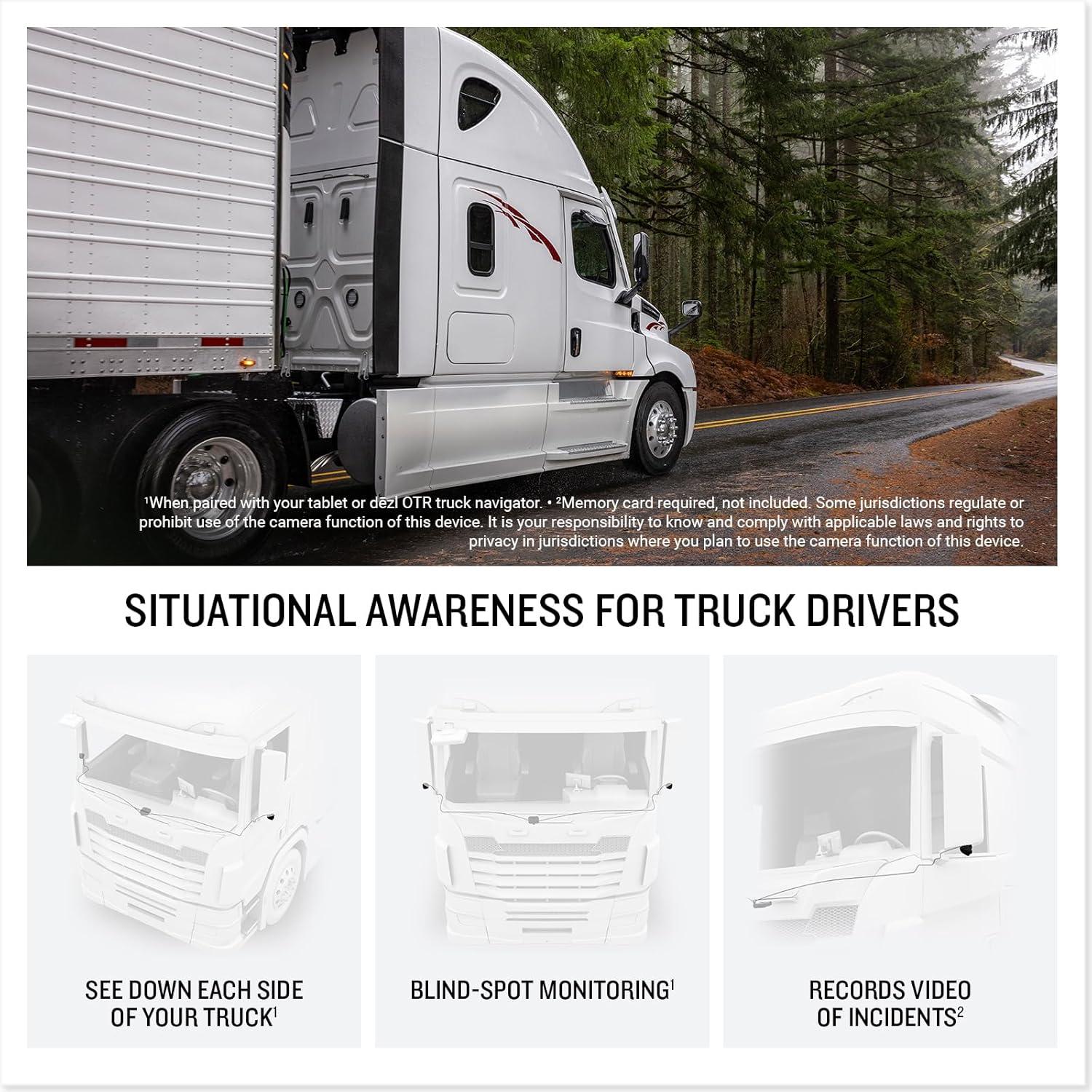 Displays a clear live camera view down the full length of each side of your truck; viewable in-cab on your paired tablet or dēzl OTR navigator