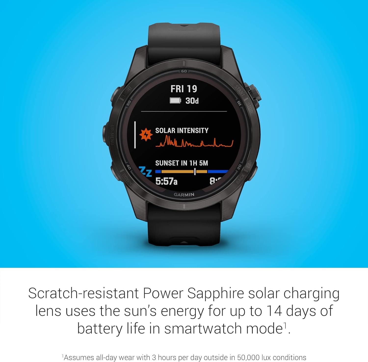 fēnix® 7S Pro Sapphire Solar is the ultimate multisport GPS smartwatch optimized for smaller wrists and designed to perform all day, every day. Get weeks of battery life with the scratch-resistant Power Sapphire™ solar charging lens. Meet any challenge with advanced training features such as hill score, which measures your climbing performance over time, and real-time stamina updates to gauge your stamina potential. For a more complete picture of your health, training and recovery, tap in to 24/7 health and wellness monitoring with advanced sleep tracking, HRV status, Pulse Ox and more (this is not a medical device, and data presented is intended to be a close estimation of metrics tracked; Pulse Ox not available in all countries). When the sun sets, use the LED flashlight to stay visible or find your way. Navigate with preloaded TopoActive maps and ski resort maps; download even more regions for global adventures. Adventure far off the grid with up to 14 days of battery life in smartwatch mode with solar charging in 3 hours of direct sunlight (50,000 lux) per day. Gain superior positioning accuracy while optimizing battery life, thanks to multi-band GPS with SatIQ™ technology.
