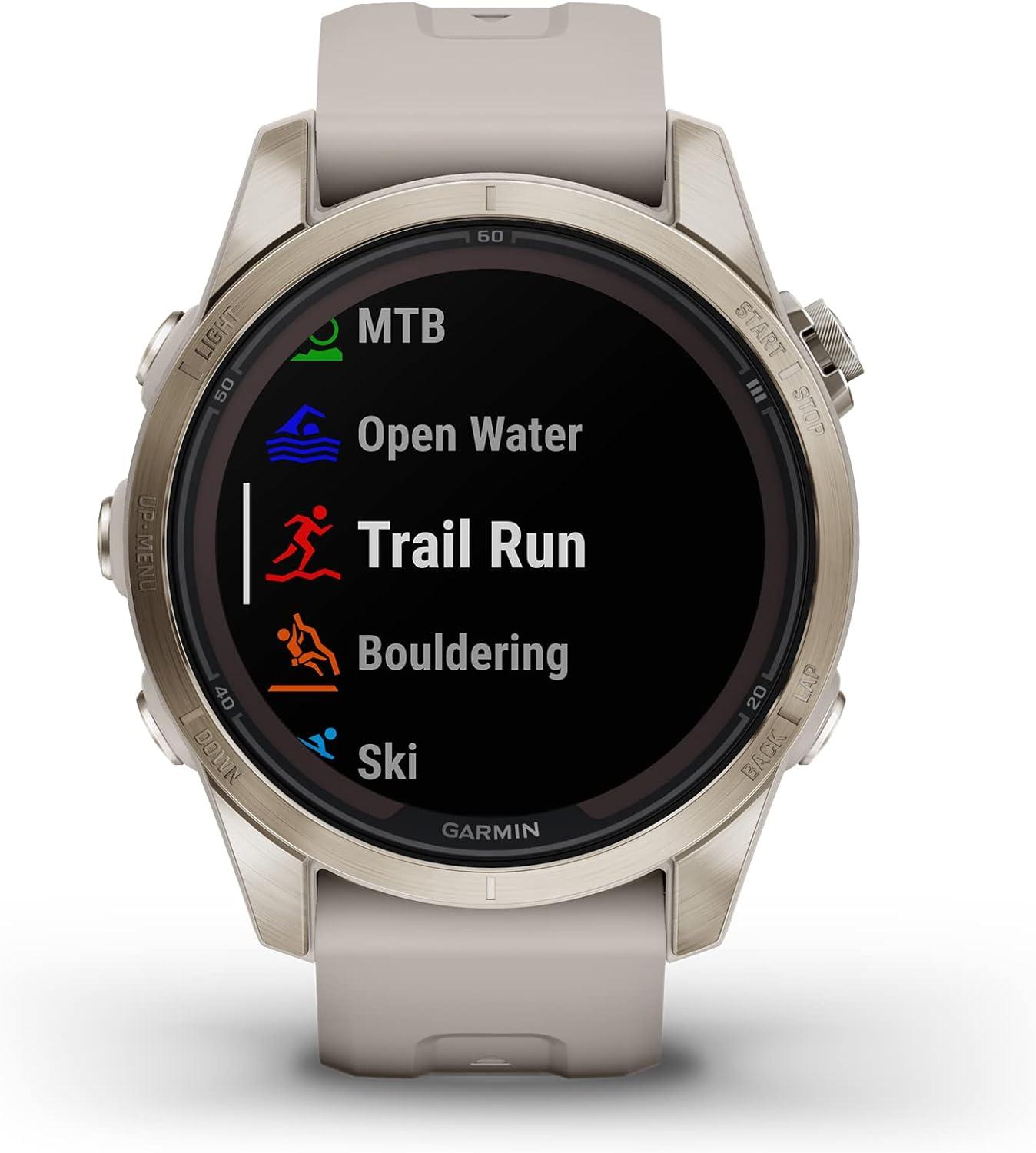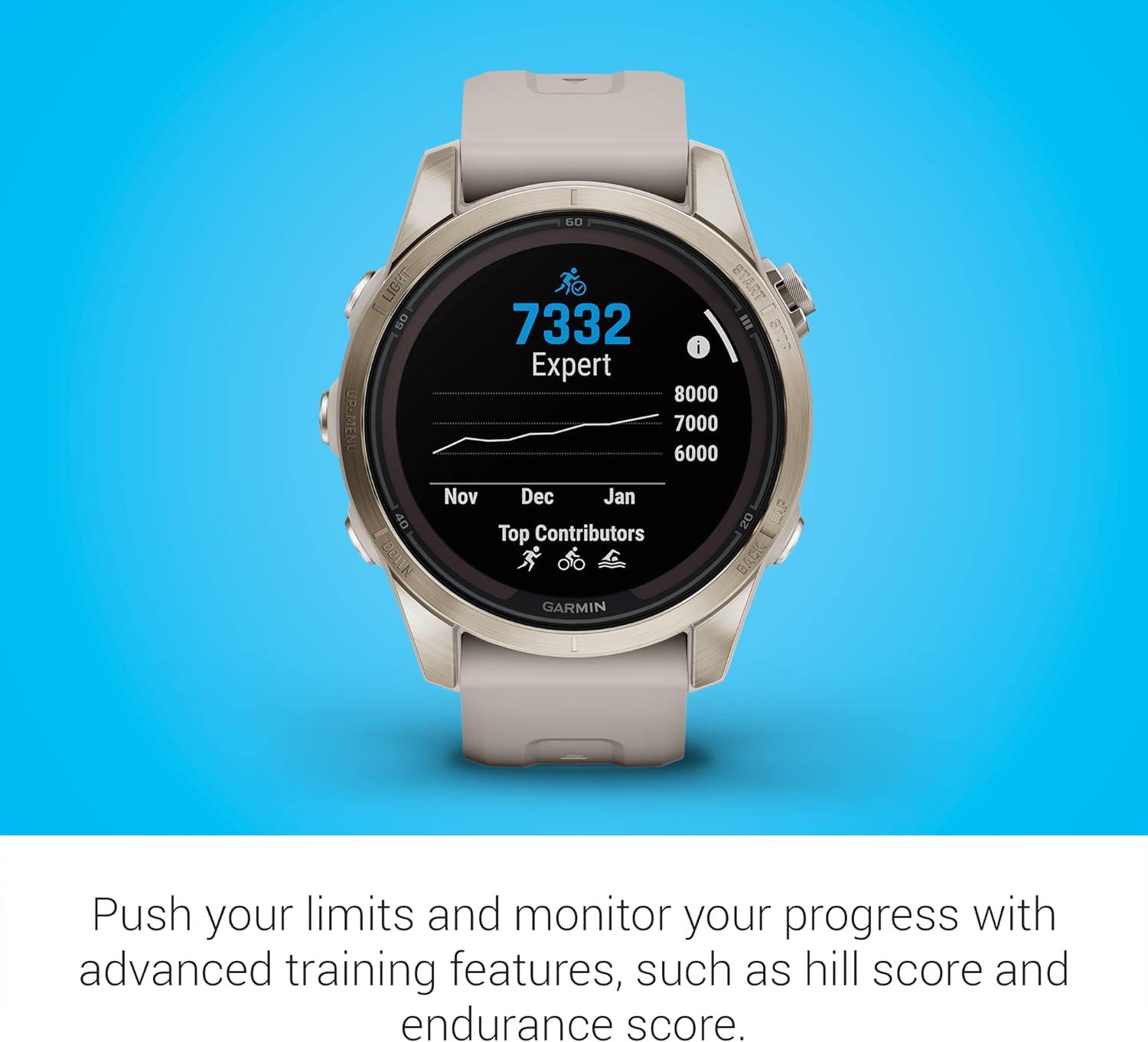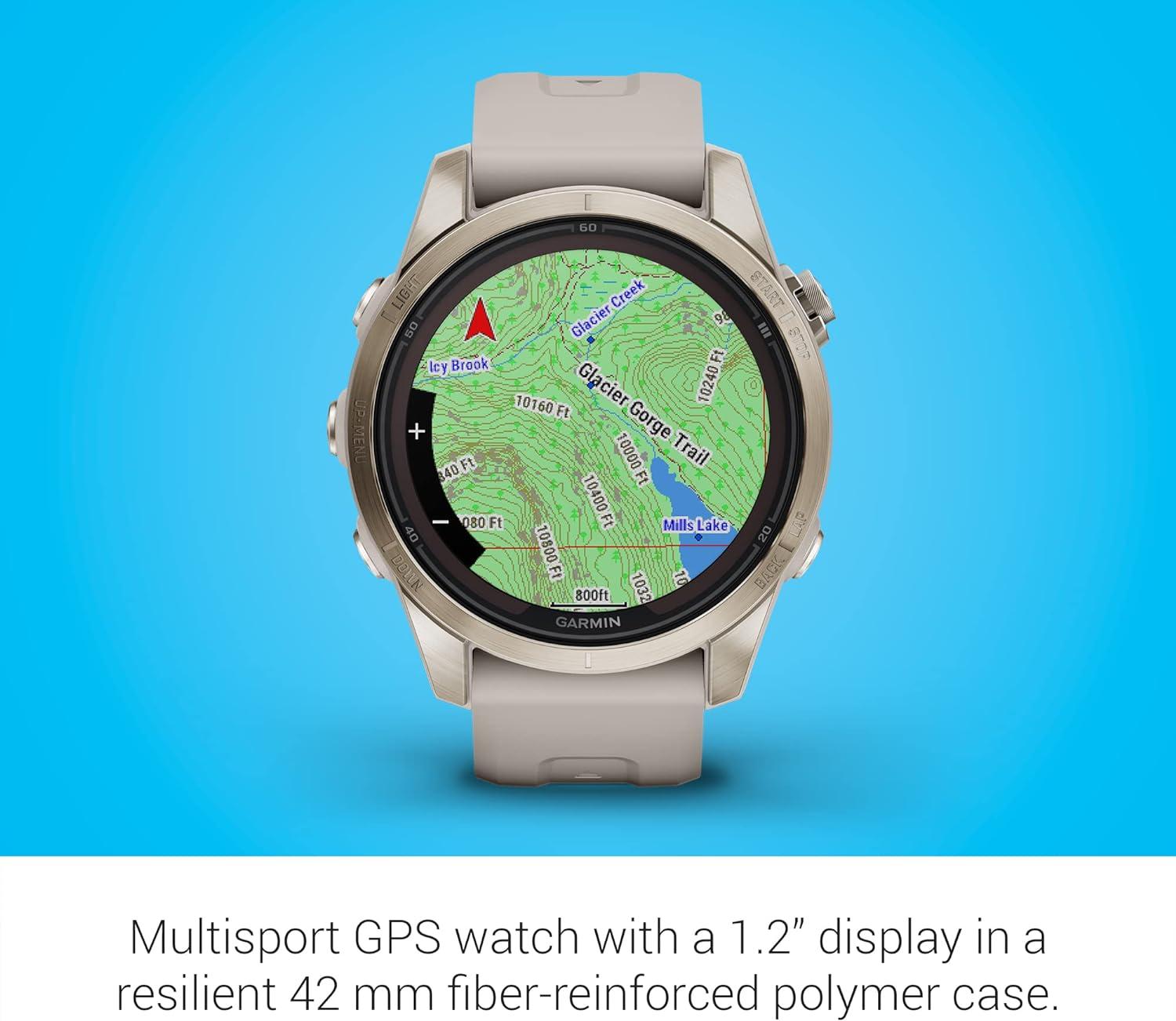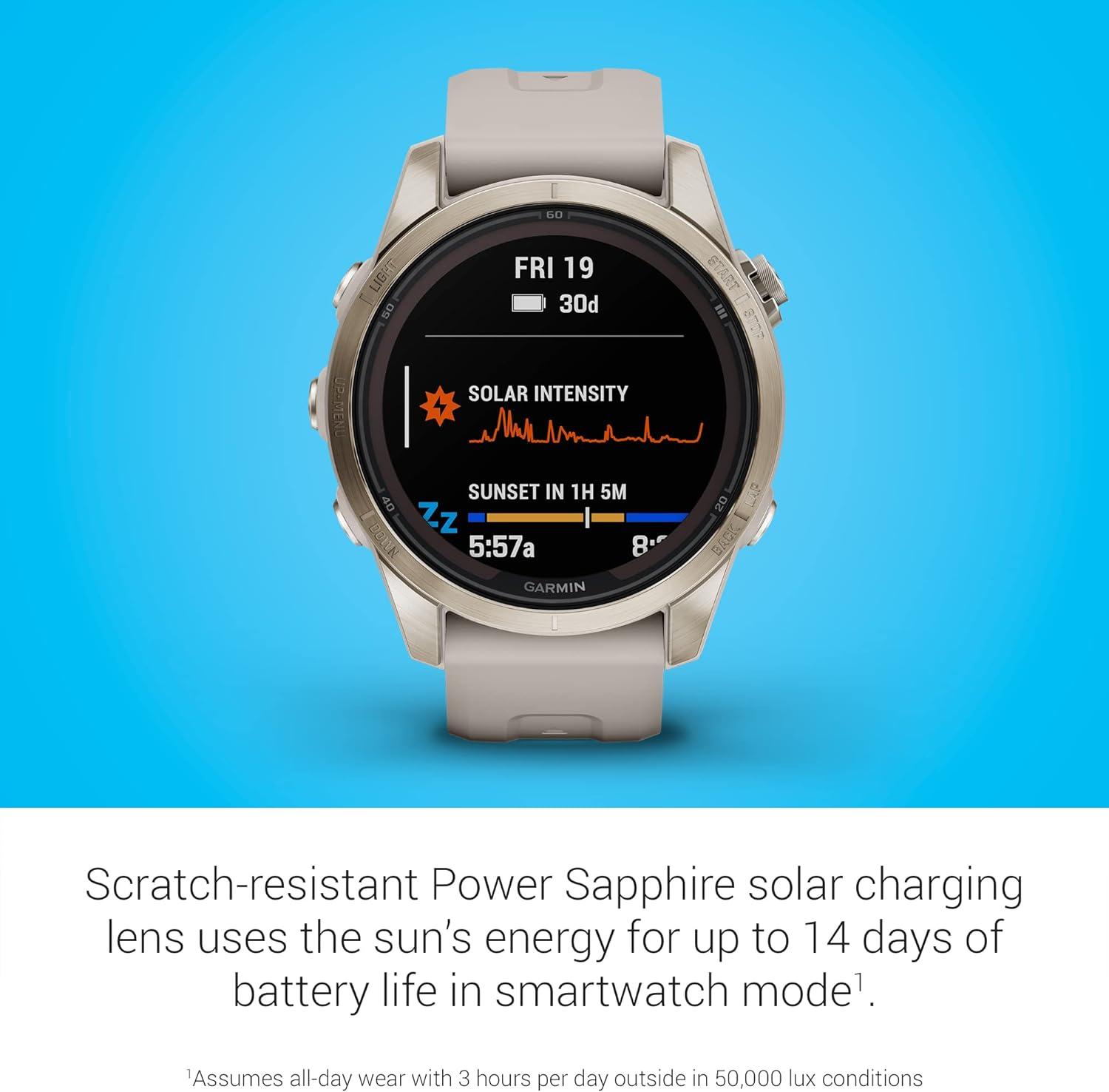 Garmin fēnix 7S Pro Sapphire Solar, Multisport GPS Smartwatch, Built-in Flashlight, Solar Charging Capability, Sand(Soft Gold with Light Sand Band)