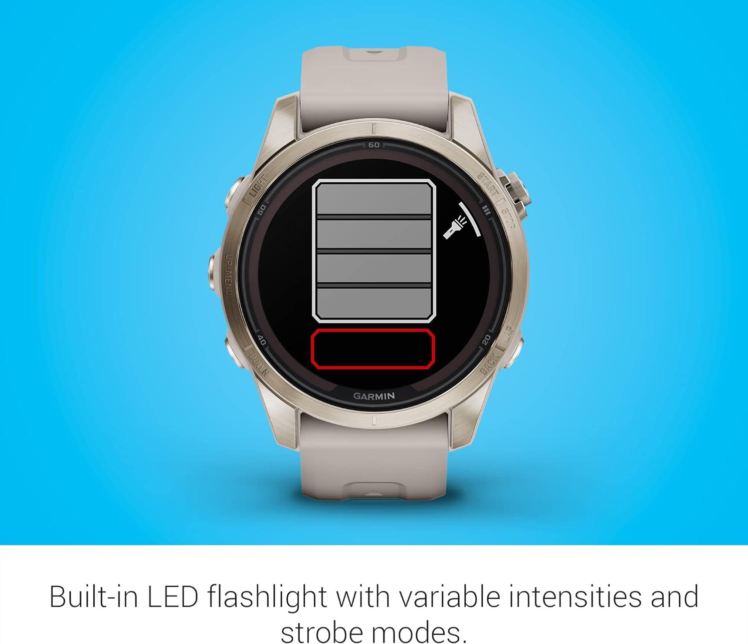 imageGarmin fnix 7S Pro Sapphire Solar Multisport GPS Smartwatch Builtin Flashlight Solar Charging Capability SandSoft Gold with Light Sand Band