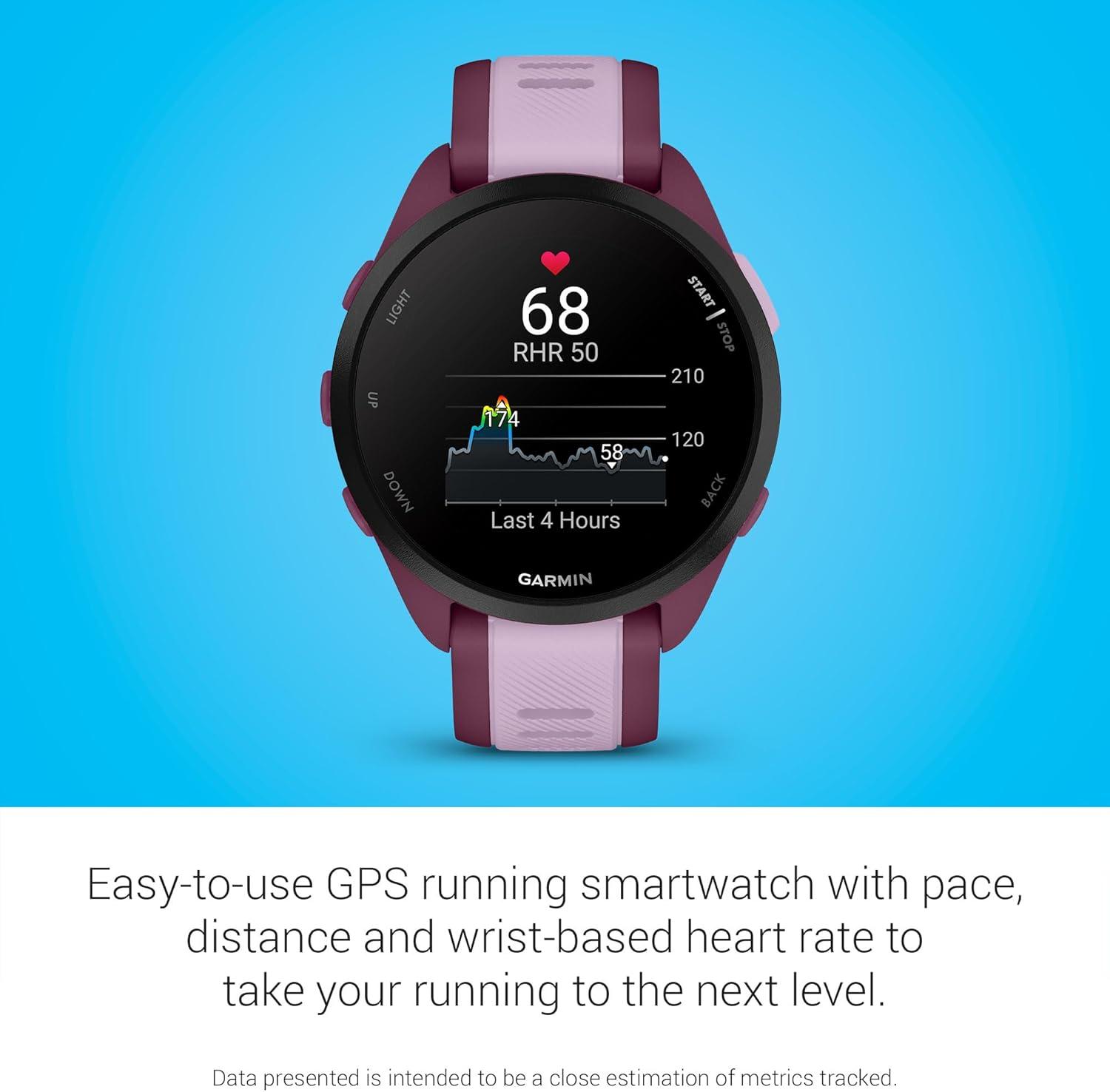 Easy-to-use running smartwatch with built-in GPS for pace/distance and wrist-based heart rate; brilliant AMOLED touchscreen display with traditional button controls; lightweight design in 43 mm size