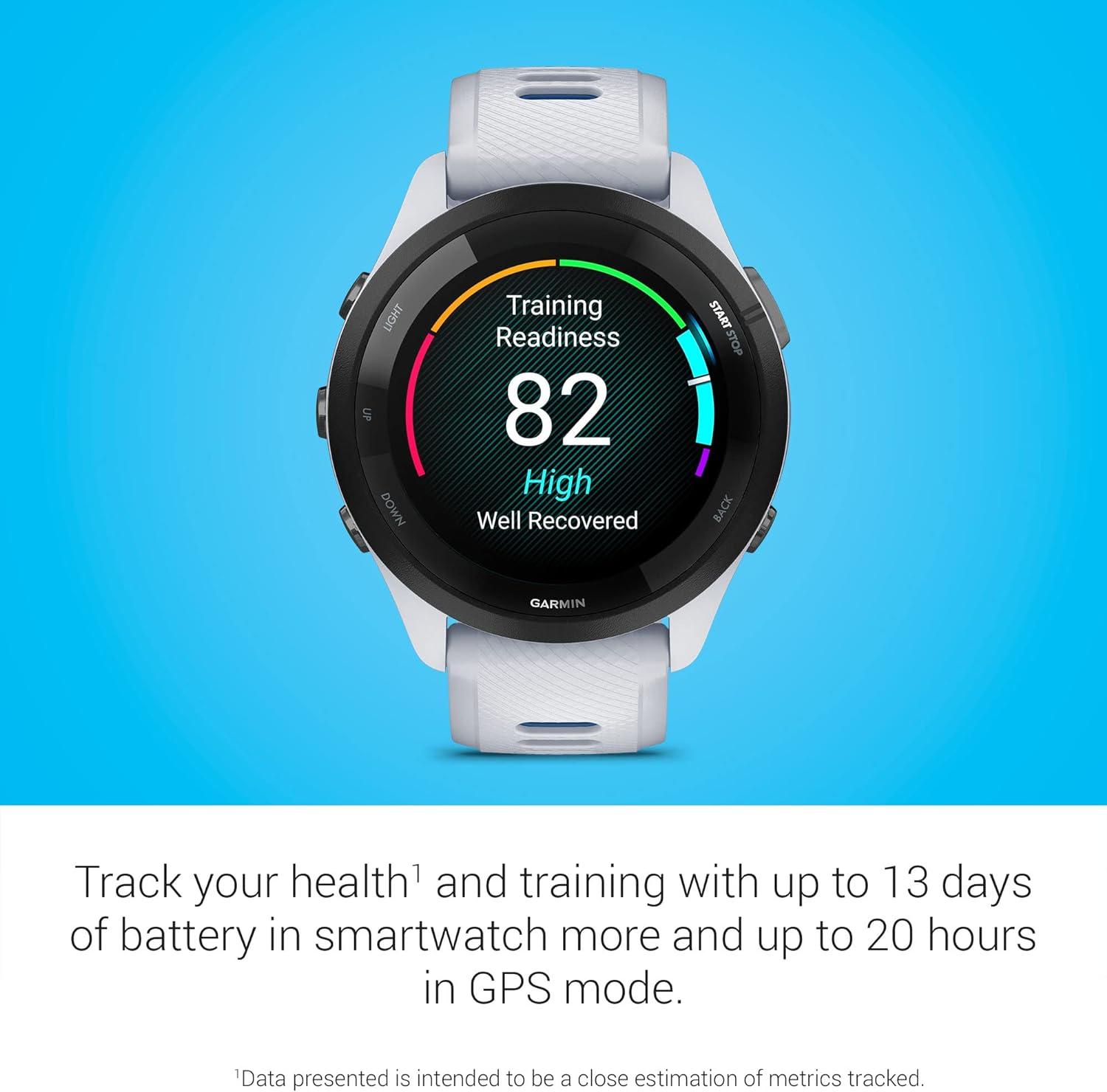 Train brilliantly with the smaller-sized Forerunner® 265S GPS running smartwatch. Its colorful AMOLED touchscreen display stands out while the training readiness feature — which tells you when you’re primed for a productive session — helps you crush your goals. Wake up to your morning report with HRV status to see health insights alongside an overview of sleep, recovery and training outlook (data presented is intended to be a close estimation of metrics tracked). Plan your race strategy with the race widget, which enables personalized daily suggested workouts that adapt to performance, recovery, the race you’re running and its course. Get ready to make the most of every run with wrist-based running power and multi-band GPS. And when you want to switch it up with cross training, choose from more than 30 activity profiles, including triathlons, cycling, swimming and more. Get a more complete picture of your health, not just a glimpse, from your Forerunner 265S with up to 15 days of battery life in smartwatch mode.
