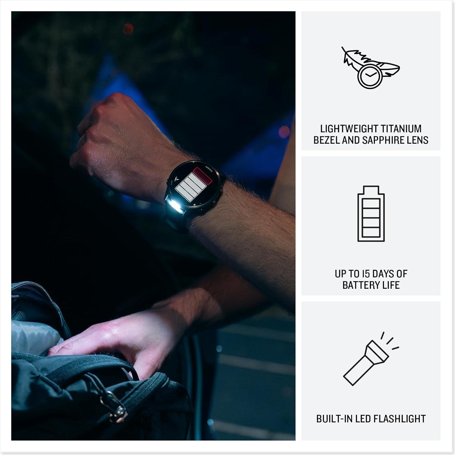Our brightest AMOLED touchscreen display with button controls, a lightweight titanium bezel and sapphire lens, plus a built-in LED flashlight for greater awareness in the dark during early morning or late-night runs