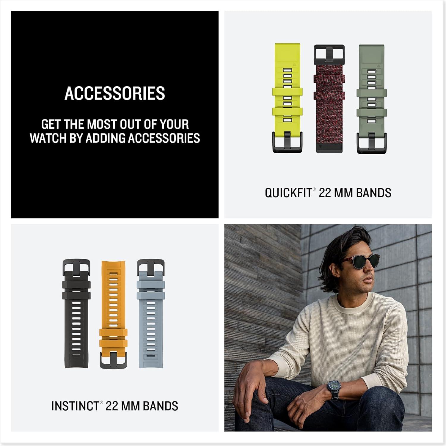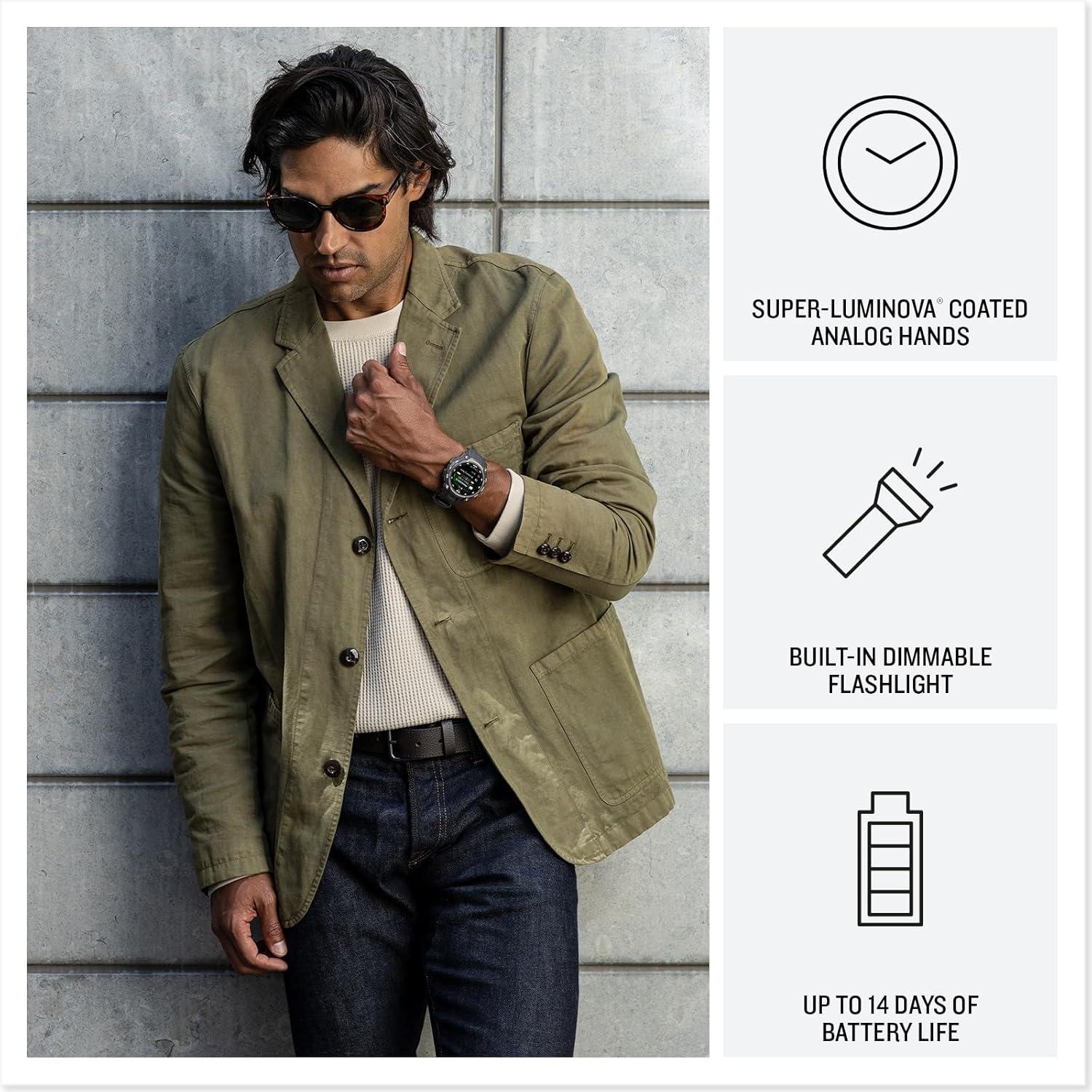 Instinct® Crossover AMOLED is the hybrid GPS smartwatch with analog watch hands and a bright AMOLED display. The 1.2’’ digital display, protected by a sapphire lens, brings data to life with detail-rich graphics. A dimmable LED flashlight and rugged MIL-STD 810 build quality for thermal and shock resistance make it ready for your toughest adventure. Superior readability of the analog hands, even in low-light conditions, is further enhanced by the bright display. All-day health and wellness monitoring keeps an eye on your heart rate, sleep, stress and more (data presented is intended to be a close estimation of metrics tracked). Stay connected with smart notifications, Garmin Pay™ contactless payments and Connect IQ™ Store integration when paired with your smartphone. Enjoy up to 14 days of battery life in smartwatch mode and up to 18 days in battery saver mode.
