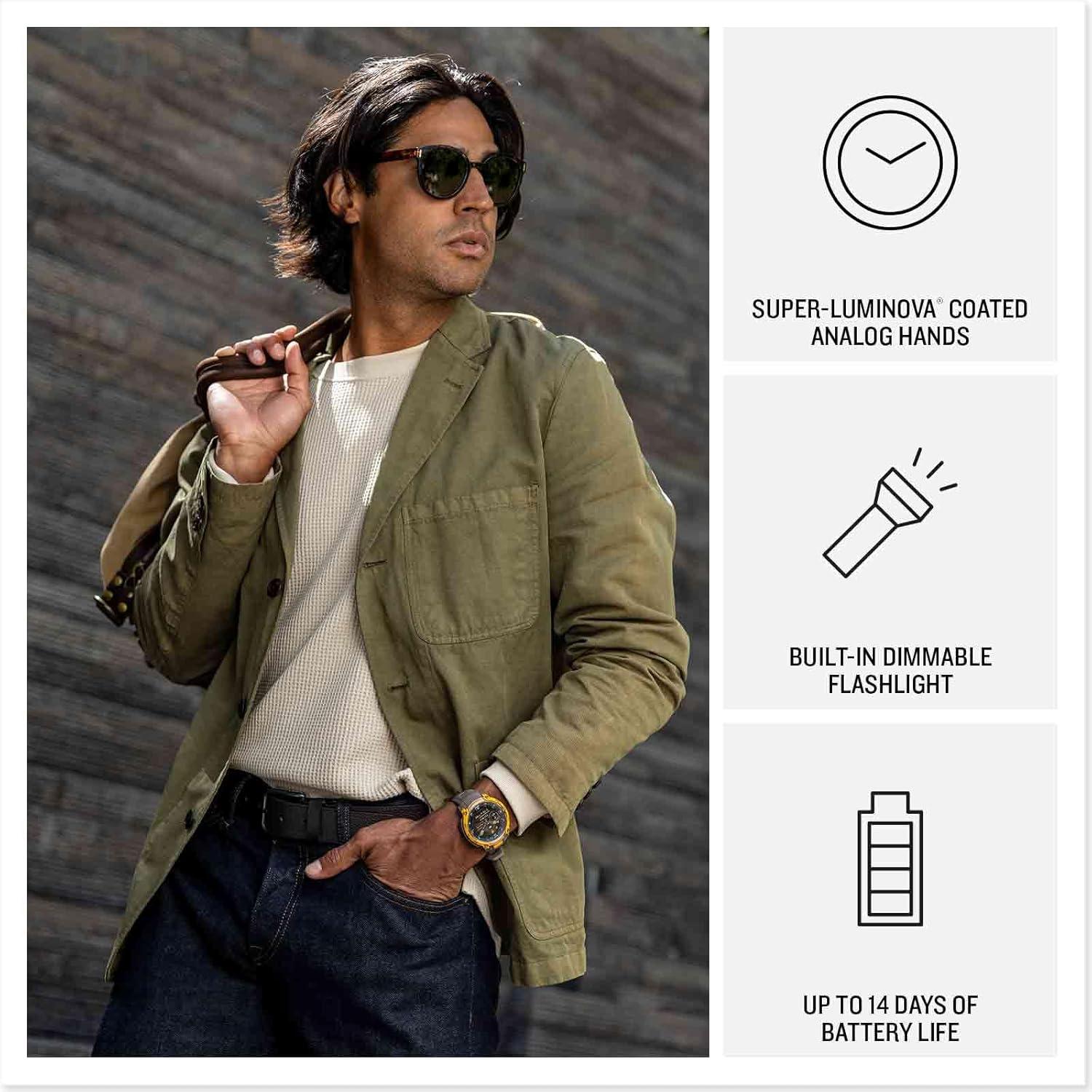 Analog hands with Super-LumiNova coating provide superior readability, even in low-light conditions, and are enhanced by the AMOLED display