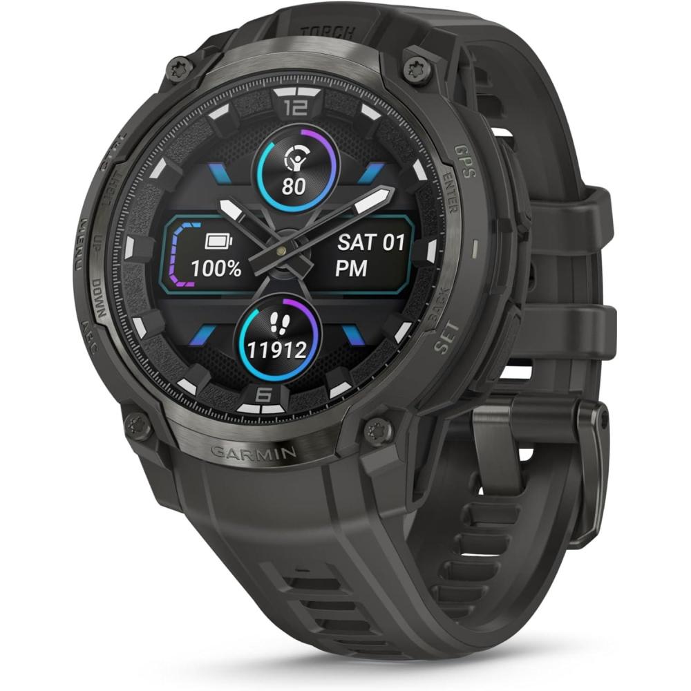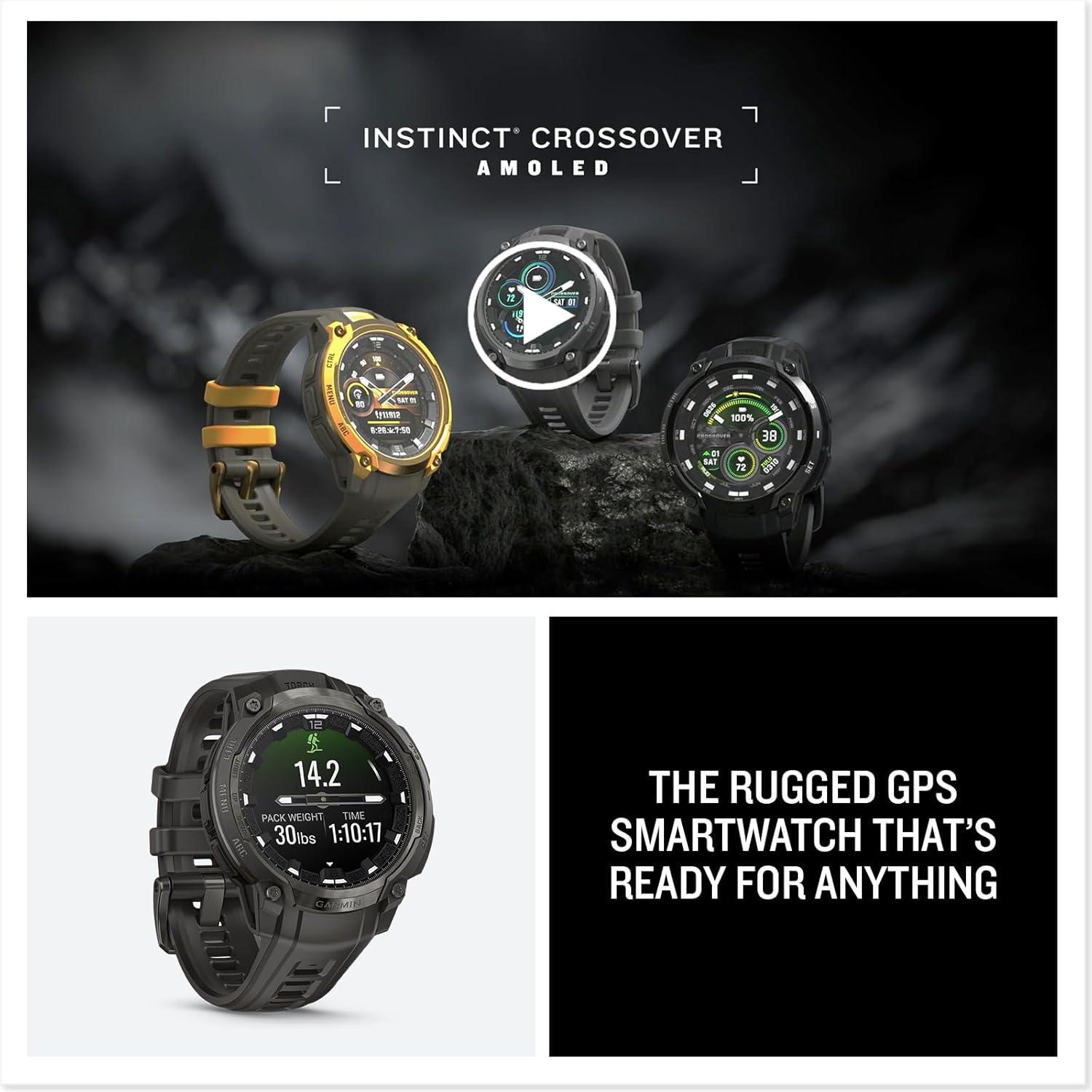Instinct® Crossover AMOLED is the hybrid GPS smartwatch with analog watch hands and a bright AMOLED display. The 1.2’’ digital display, protected by a sapphire lens, brings data to life with detail-rich graphics. A dimmable LED flashlight and rugged MIL-STD 810 build quality for thermal and shock resistance make it ready for your toughest adventure. Superior readability of the analog hands, even in low-light conditions, is further enhanced by the bright display. All-day health and wellness monitoring keeps an eye on your heart rate, sleep, stress and more (data presented is intended to be a close estimation of metrics tracked). Stay connected with smart notifications, Garmin Pay™ contactless payments and Connect IQ™ Store integration when paired with your smartphone. Enjoy up to 14 days of battery life in smartwatch mode and up to 18 days in battery saver mode.