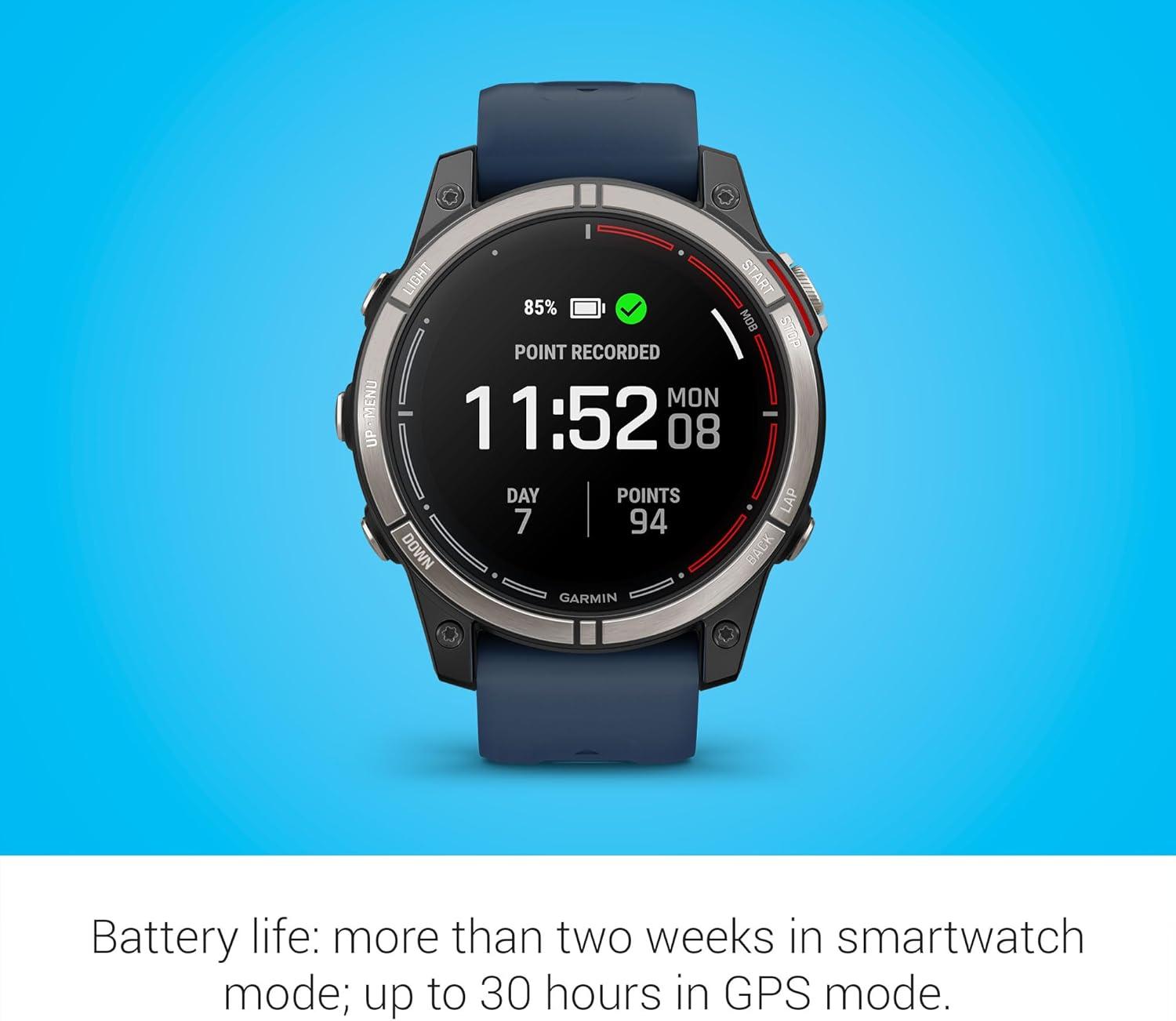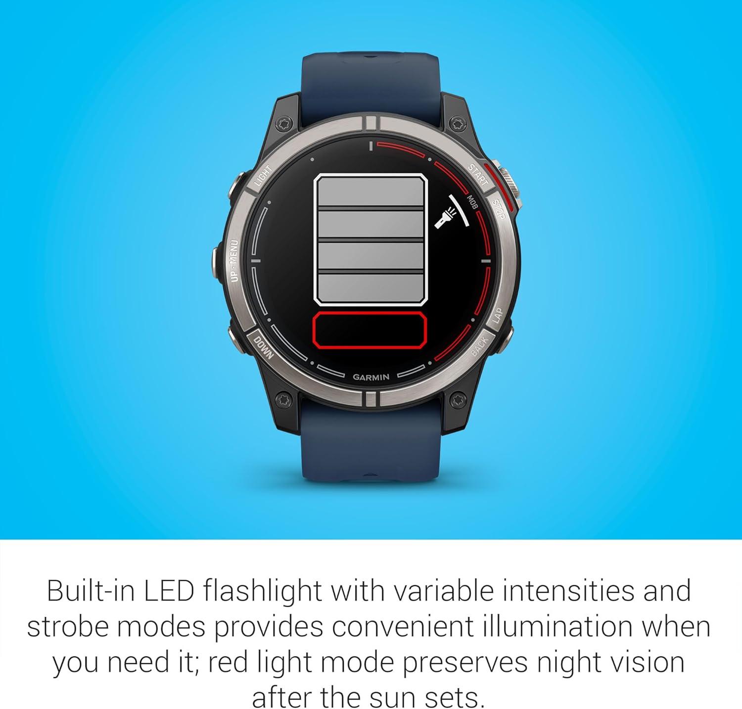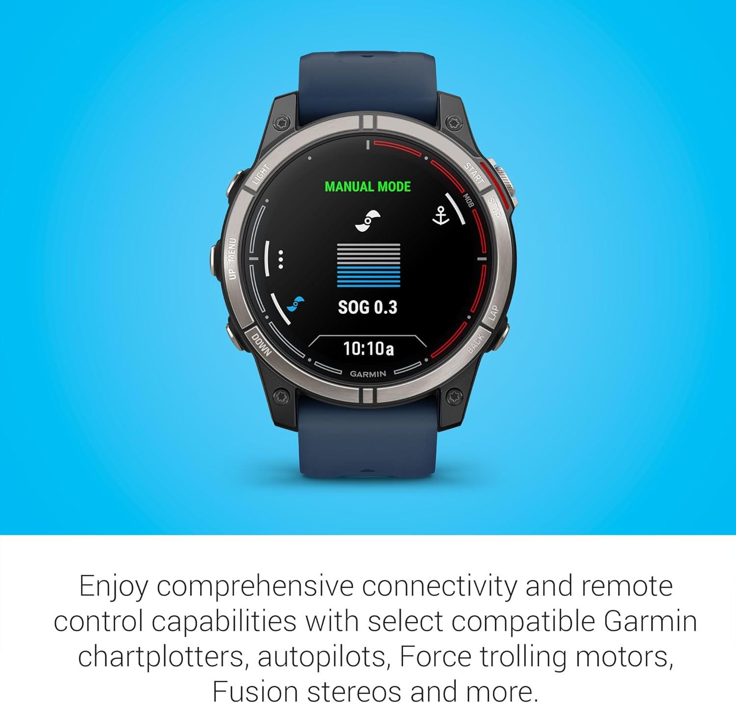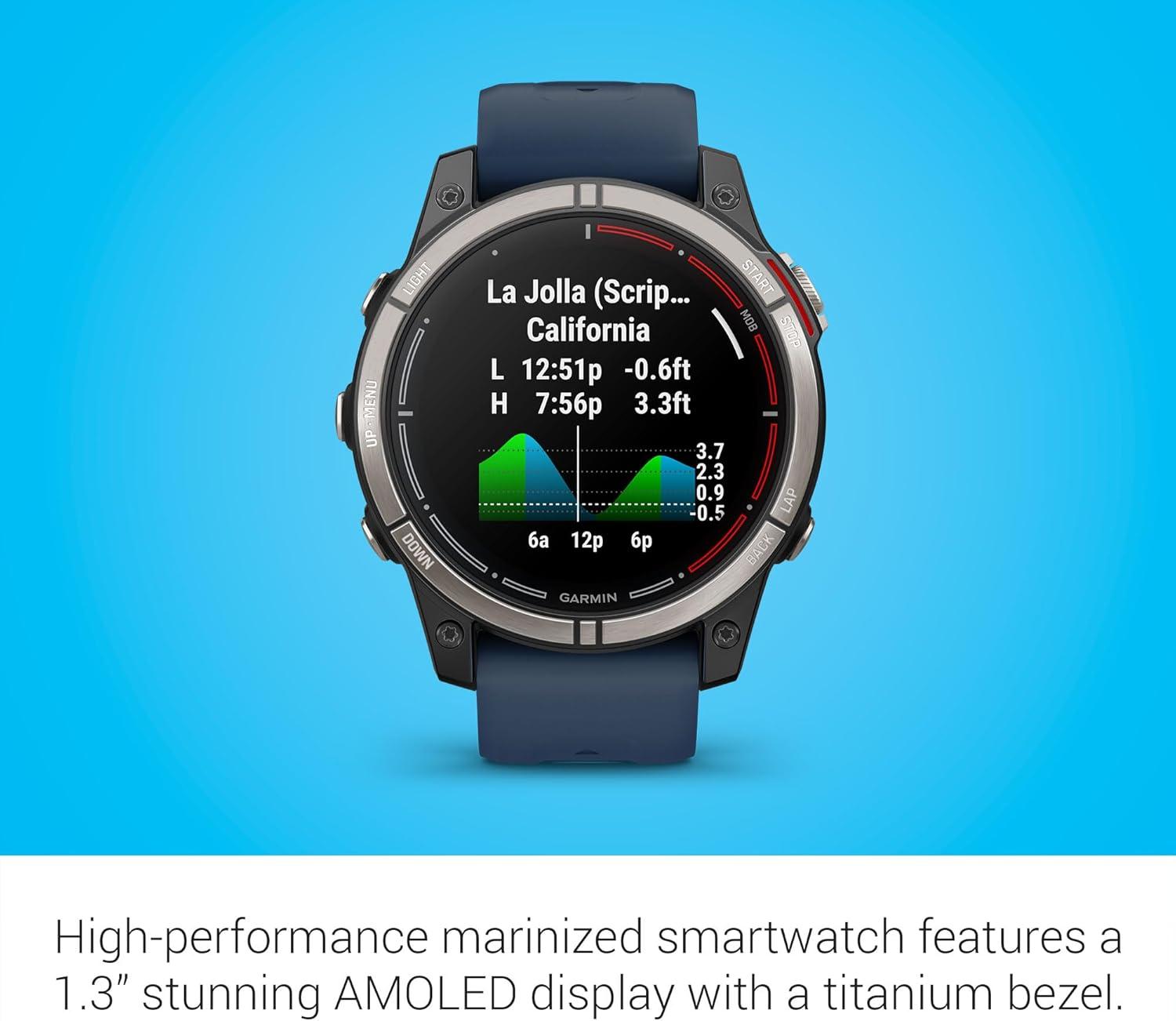Plot your paradise on the water and beyond with quatix® 7X – Solar Edition, the multisport GPS smartwatch that has all the features you need on your boat and the ones you want off it, including solar charging. quatix 7X – Solar Edition provides comprehensive connectivity with compatible Garmin chartplotters and other compatible marine devices to offer autopilot control, data streaming, Fusion-Link™ entertainment system control, integrated tide data on the watch face, new alarms for better situational awareness and much more. Use traditional button controls or the new touchscreen interface to access selections. This smartwatch includes preloaded maps for thousands of golf courses and ski resorts worldwide and has preloaded TopoActive maps for outdoor adventures. When paired with your compatible smartphone, enjoy advanced smartwatch features for all-day wearability include built-in activity profiles for water and land sports, performance metrics, smart notifications, 24/7 health monitoring, access to the Garmin Connect™ app and Garmin Pay™ contactless payments (with a supported country and payment network)